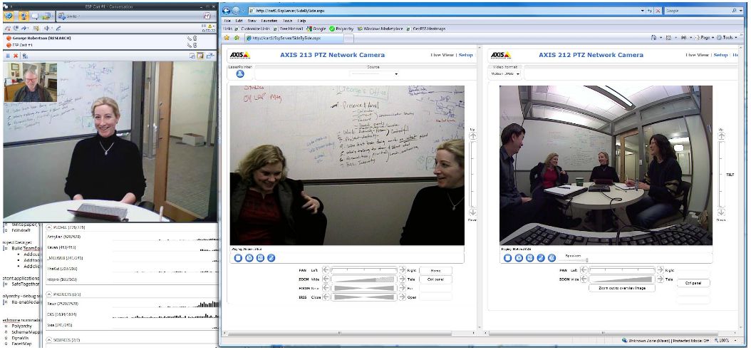 The set up is pretty simple. It’s basically just a “computer on a cart” although they did put particular care into how they used and positioned the cameras. They found that it was best to use multiple cameras, one with pan-tilt-zoom abilities and a second nifty $650 fisheye lens camera that allows the remote worker to take in a 140 degree view of a space. This means the remote worker can participate more fully in a meeting since he or she can now actually see what’s happening on the whiteboard (which is essential in brainstorming and design sessions). It’s also nice to be able to see all of the people in a meeting at the same time and to see who’s talking, especially those sitting to the sides of the camera.